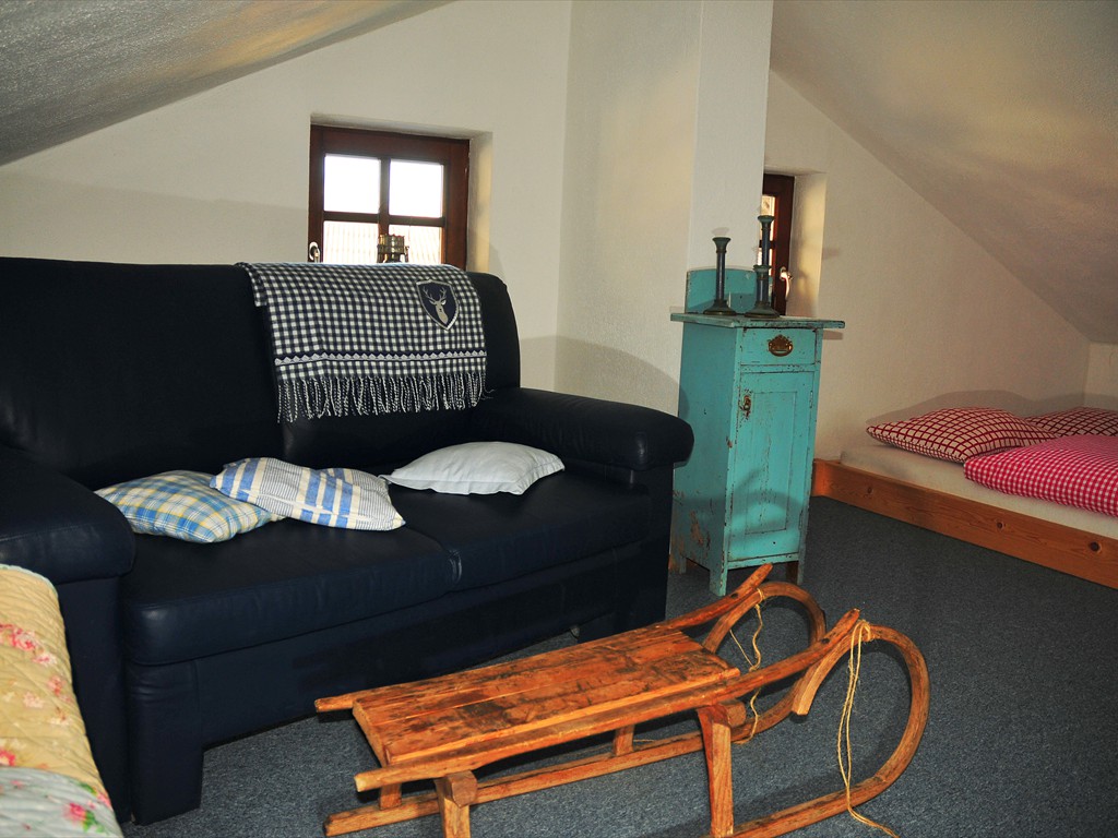 Galerie mit Doppelbett, Sofa, Fernseh und Kinderspielecke